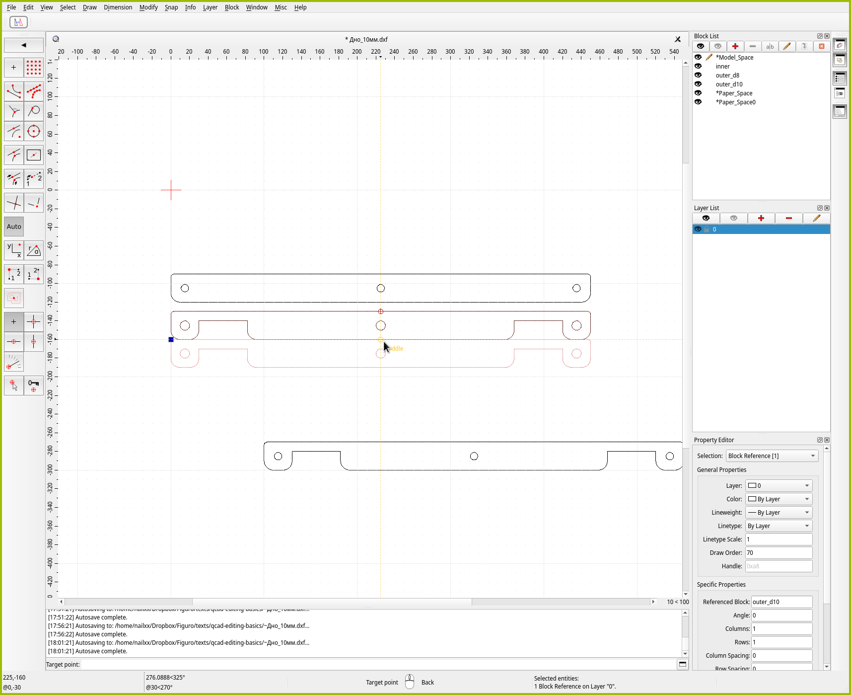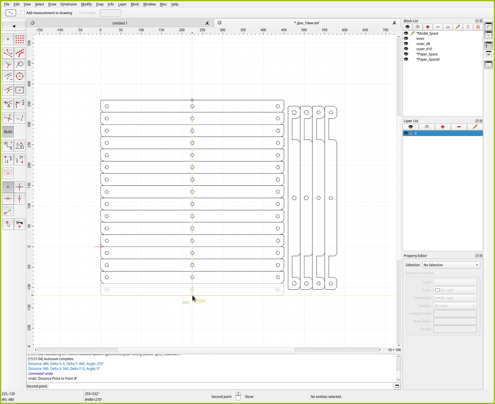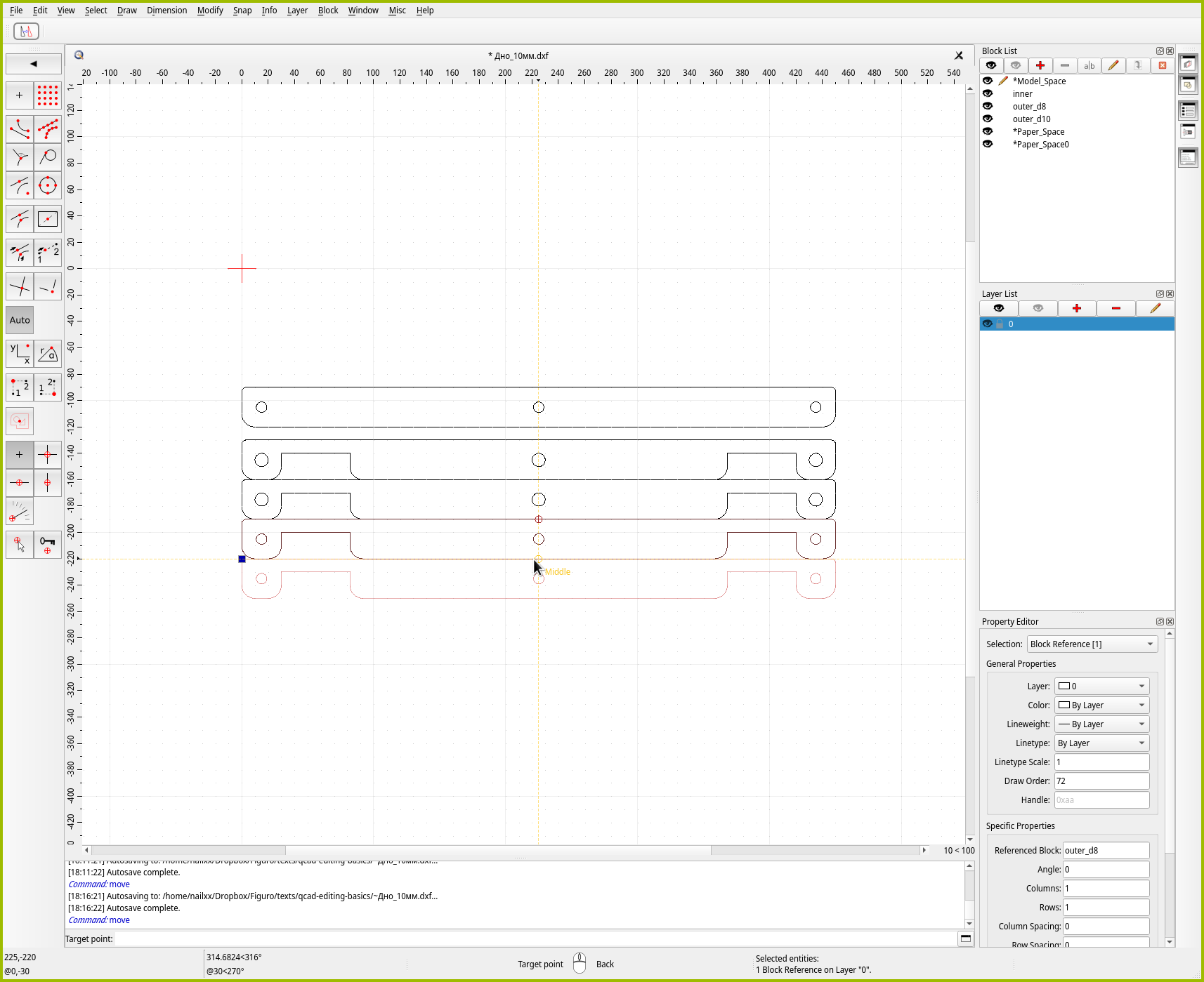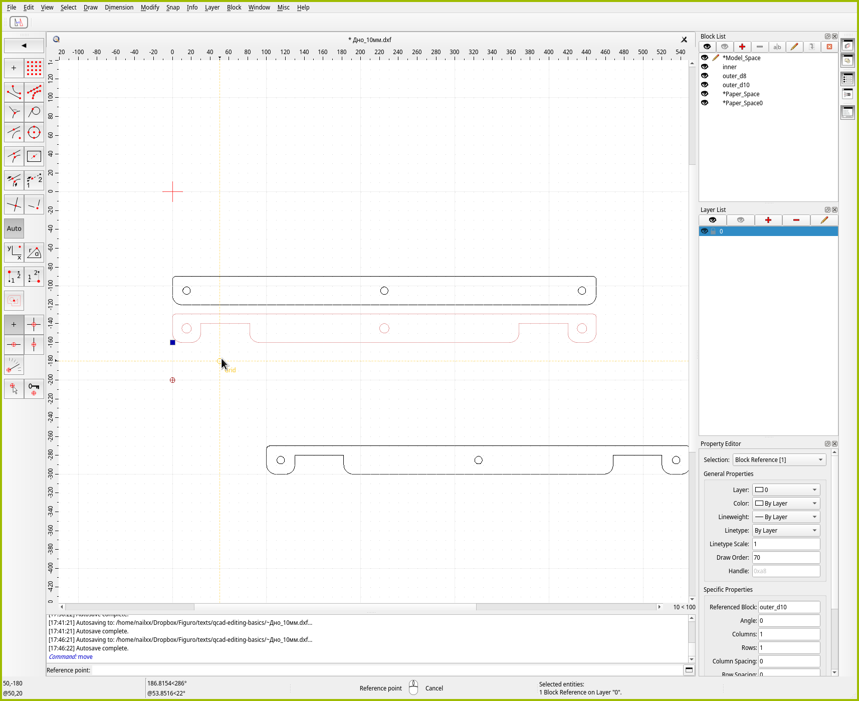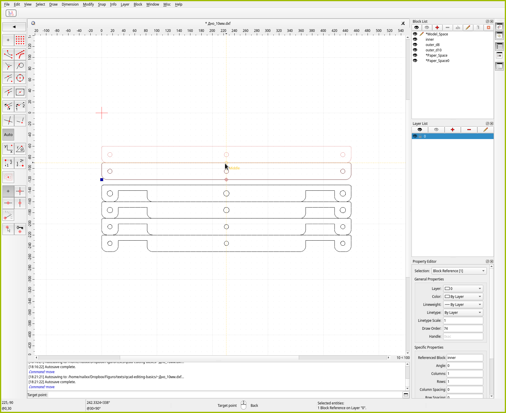 Для точного позиционирования в QCAD есть отдельный инструмент “Move / Copy”. Как можно понять из названия, инструмент либо перемещает, либо размножает объекты. Давайте им воспользуемся, чтобы создать копию средней детали. Чтобы сэкономить место на листе, зададимся целью поставить две копии идеально плотно друг к другу.