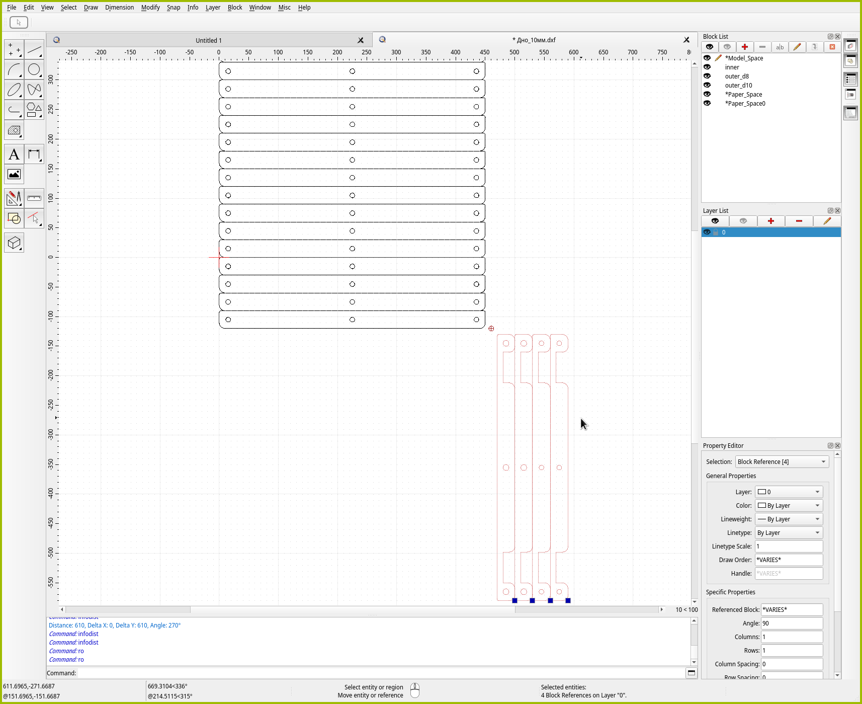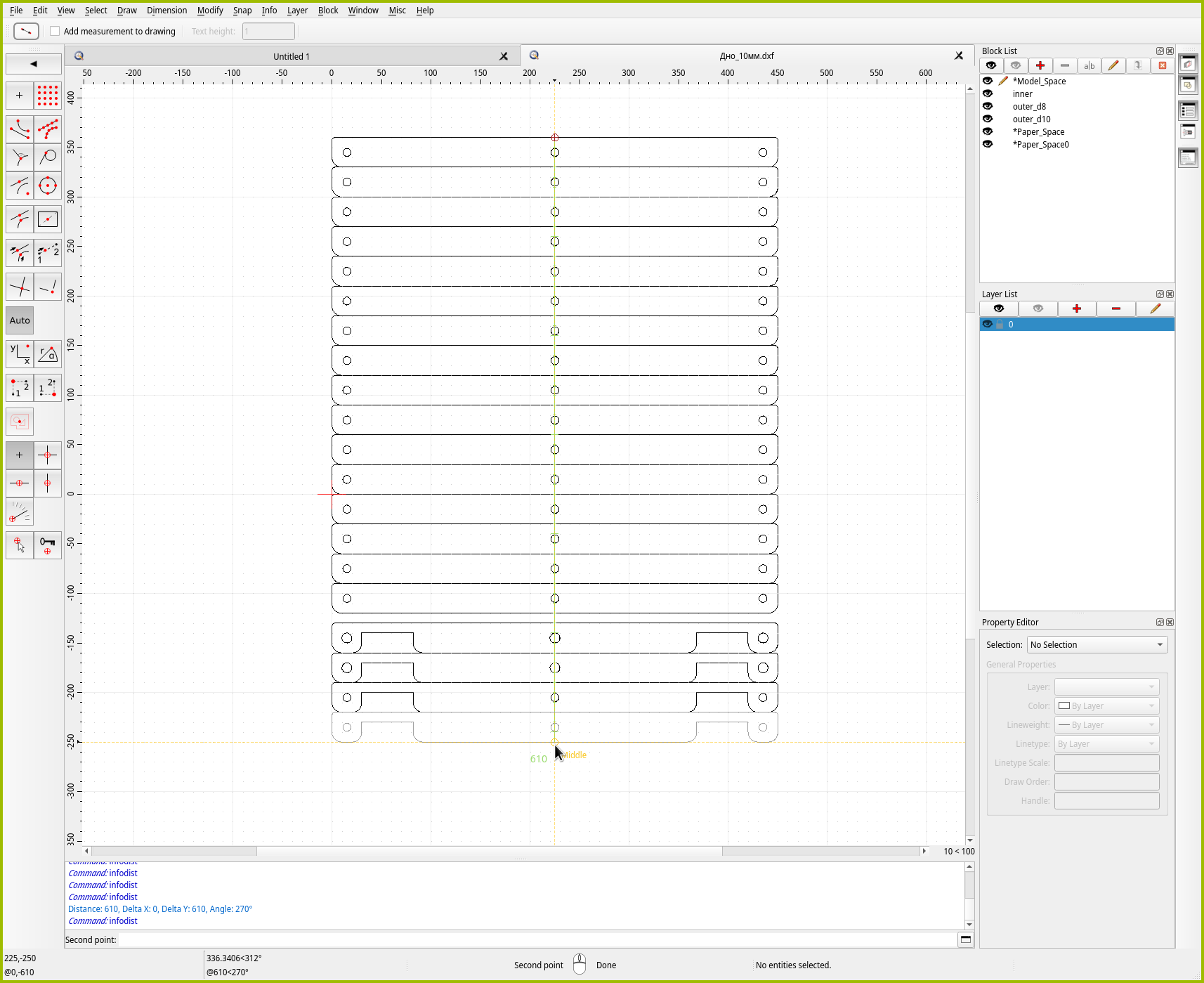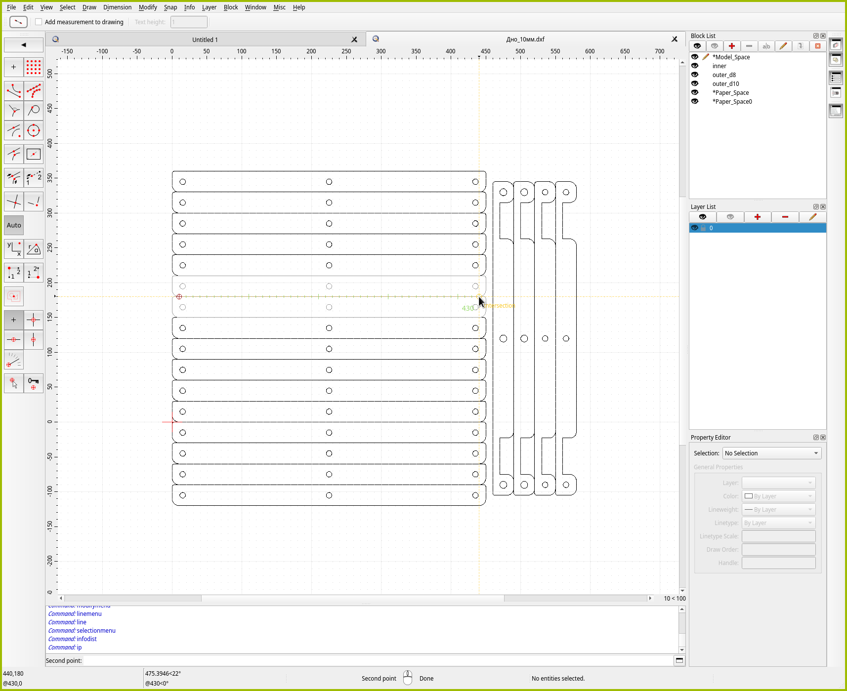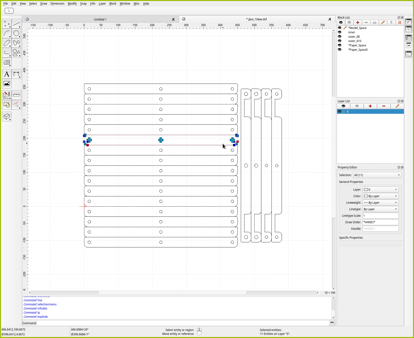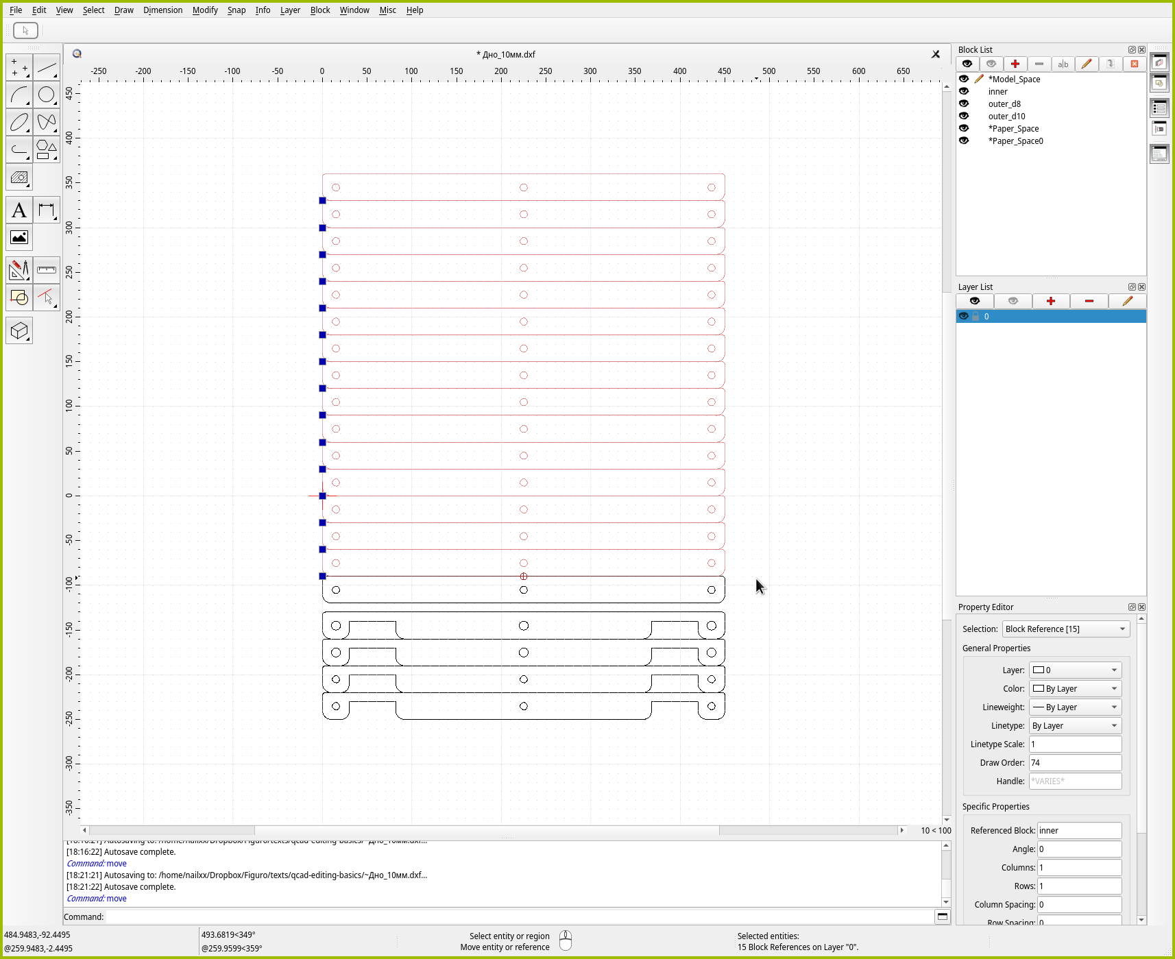 Для точного позиционирования в QCAD есть отдельный инструмент “Move / Copy”. Как можно понять из названия, инструмент либо перемещает, либо размножает объекты. Давайте им воспользуемся, чтобы создать копию средней детали. Чтобы сэкономить место на листе, зададимся целью поставить две копии идеально плотно друг к другу.