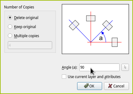 После выбора оси вращения вы увидите окно, которое очень напоминает то, что появлялось при использовании инструмента перемещения. Всё верно, здесь вы точно так же можете решить, что делать с оригиналом и сколько копий создавать. И конечно же, здесь вы можете указать угол, на который нужно повернуть объекты. Углы отсчитываются против часовой стрелки в градусах, как в школьной математике. Нам нужен угол 90°.