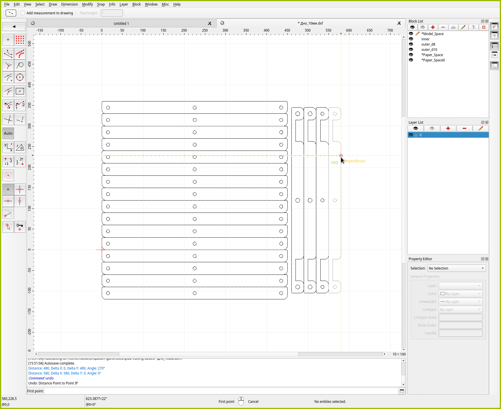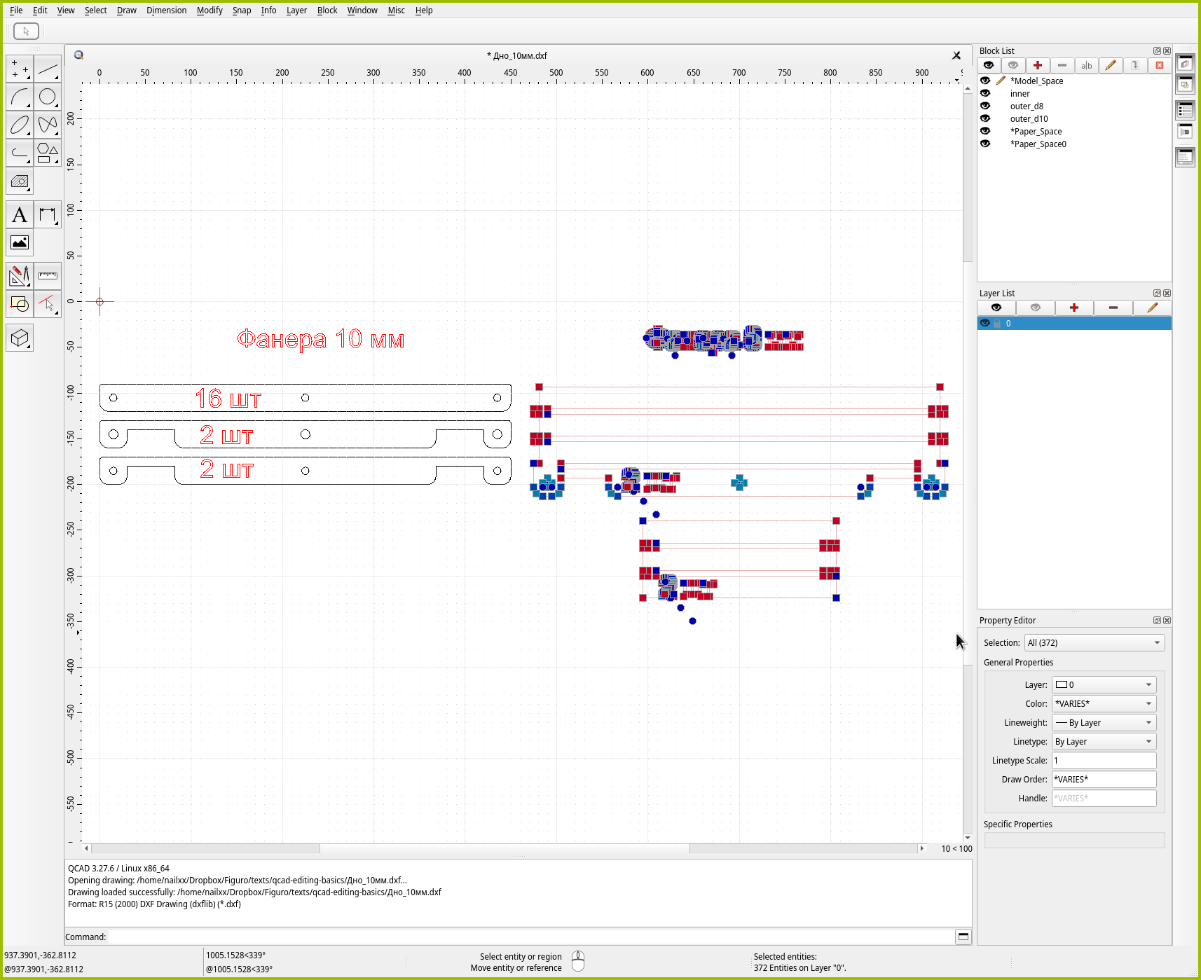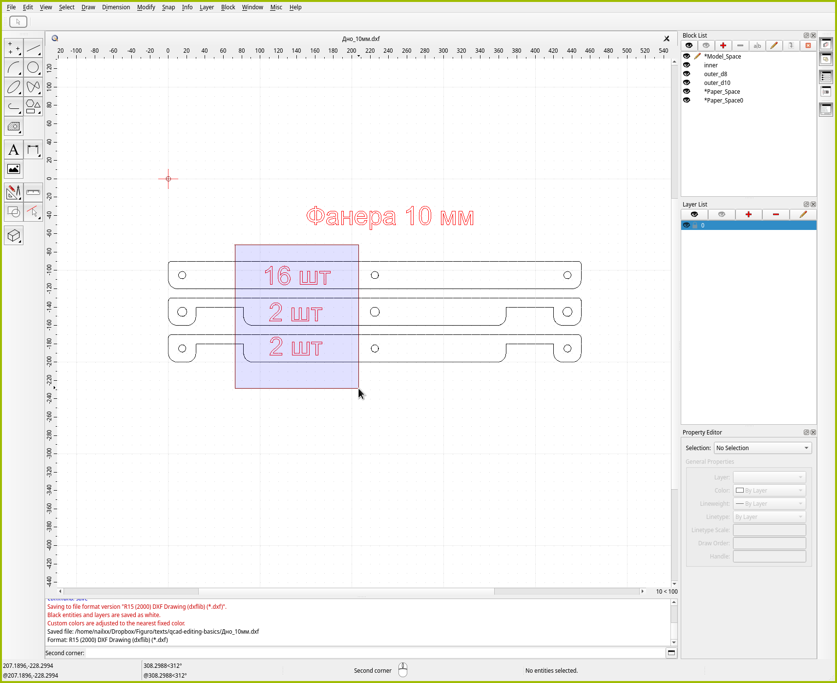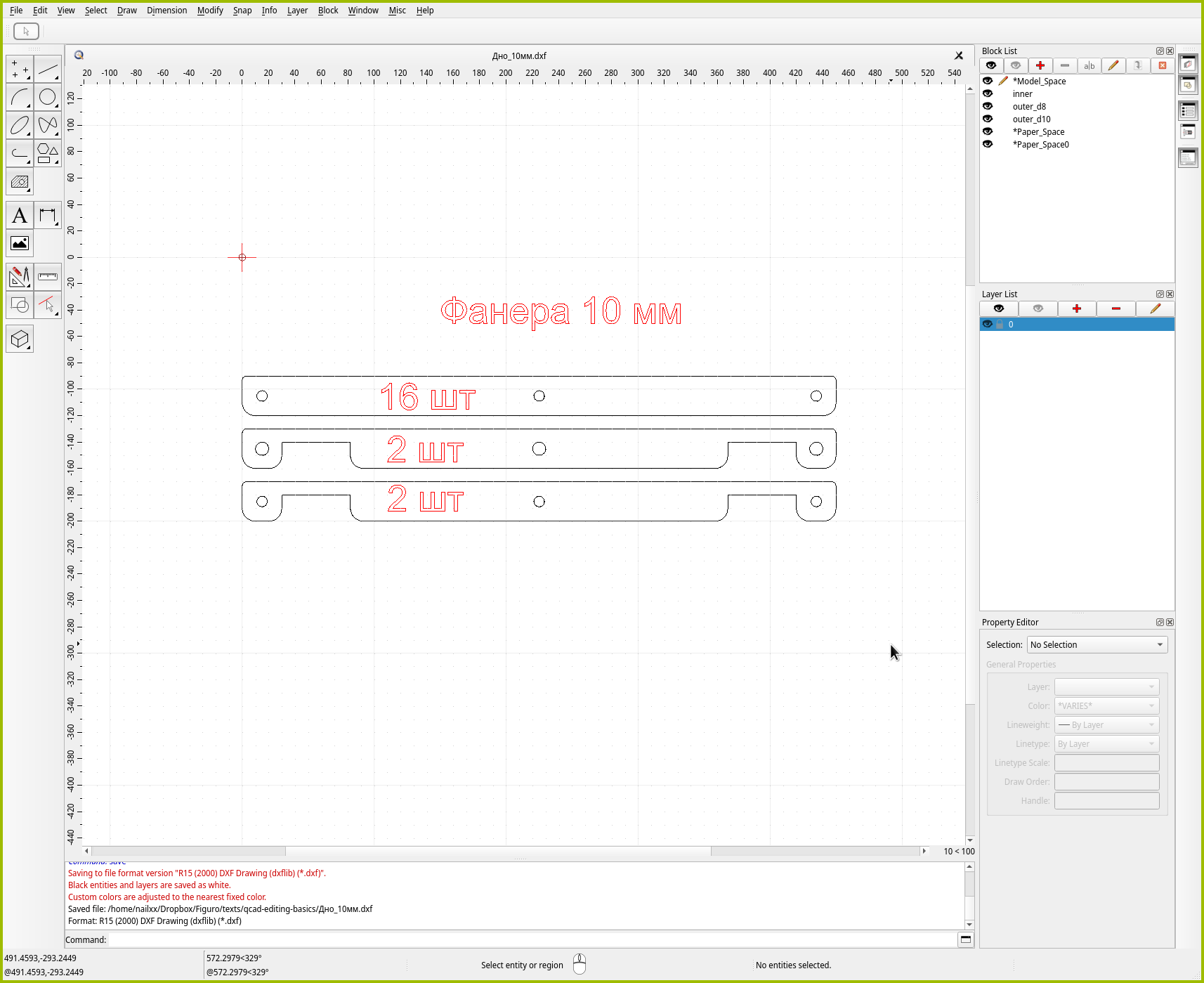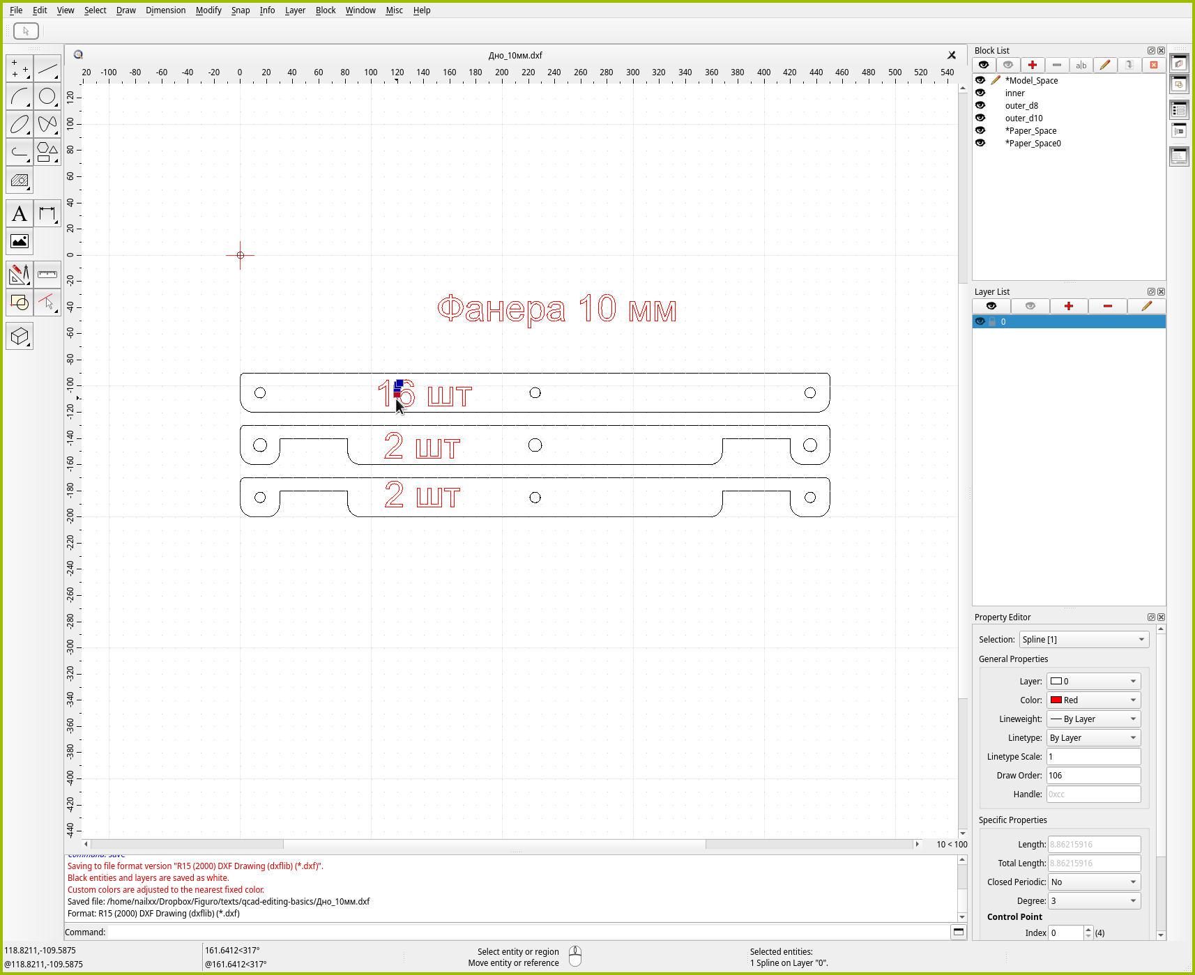 Воспользуемся первым способом. Выберите “File → Save As” или нажмите Ctrl+Shift+S и сохраните исходник с новым именем. Например, Дно_10мм.dxf. В нём мы оставим только те детали, которые будем резать на десятимиллиметровой фанере.