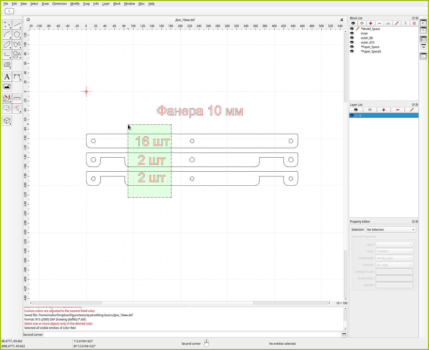 И, наконец, финальный приём в обойму ваших инструментов для выделения объектов. QCAD позволяет выделить все контуры определённого цвета разом. Поскольку в макетах для лазерной резки цвета чаще всего имеют утилитарную функцию, выделить всё-всё-всё одного цвета может оказаться кратчайшим путём к решению задачи. Прямо как в нашем случае.